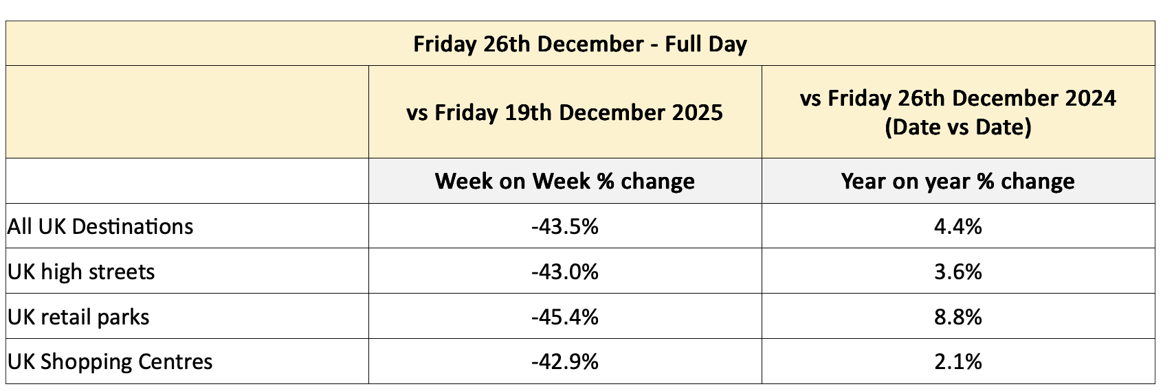 Footfall data from retail technology specialist MRI Software shows strong performance for UK retail destinations on Boxing Day with footfall up +4.4% year on year across the board; the strongest increase seen in over ten years.