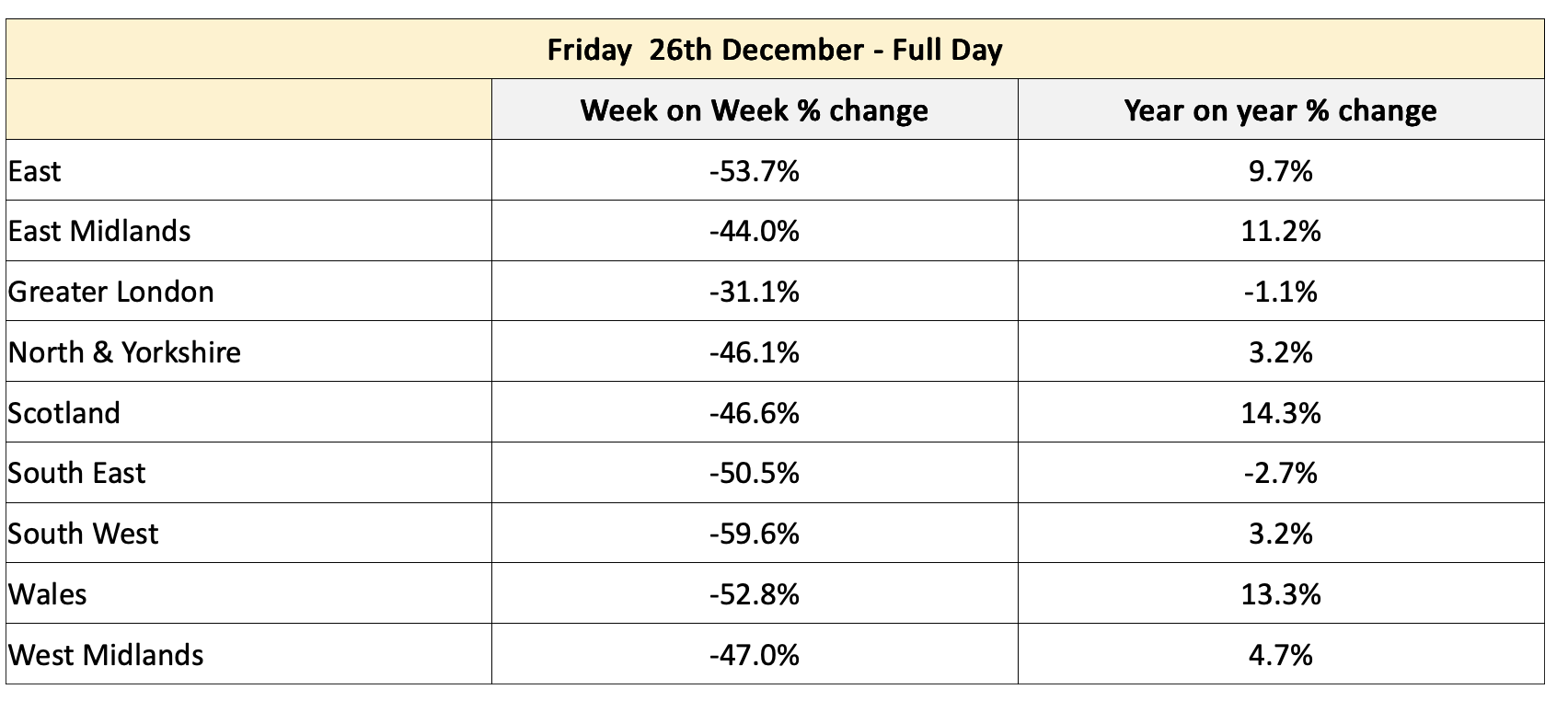 The boost in activity was driven by a peak in visits across all UK retail destinations from 5pm - 11pm averaging +9.6% versus an average increase of +3.1% from 6am-5pm. With a number of stores still shut and not reopening until today, it’s likely that leisure and hospitality establishments may well have benefited from the annual uplift.