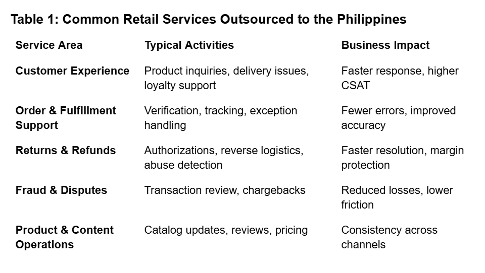 Table 1: Common Retail Services Outsourced to the Philippines