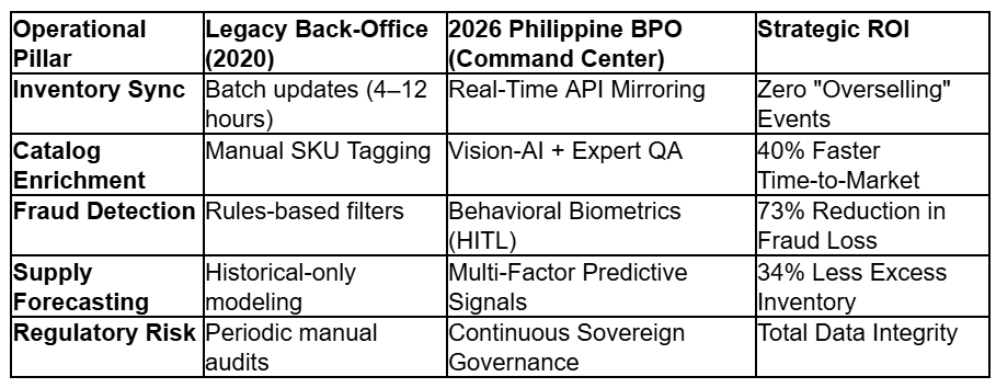Q: What is "Information Density Arbitrage" in e-commerce outsourcing? A: It is the strategy of moving complex, data-heavy back-office functions - like inventory orchestration and fraud triage - to a high competency hub like the Philippines to achieve superior data accuracy and lower operating costs.