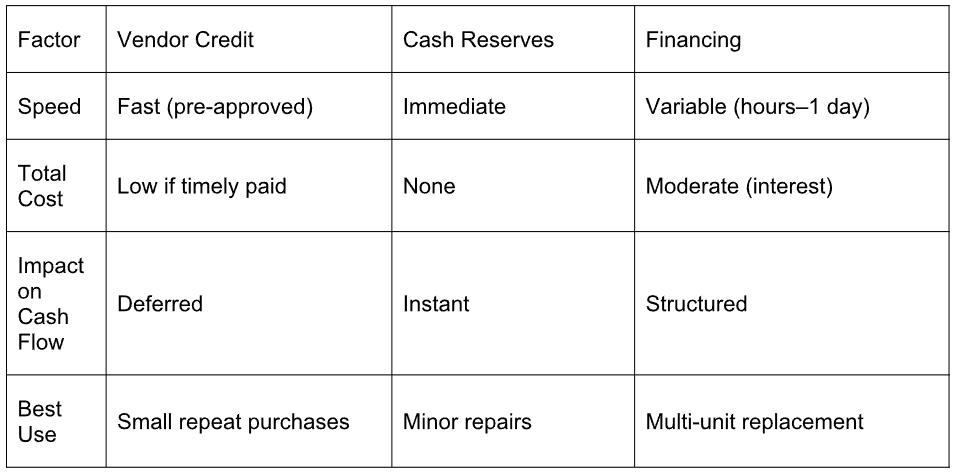 Funding Urgent Replacements: Vendor Credit, Cash Reserves, and Liquidity Rules