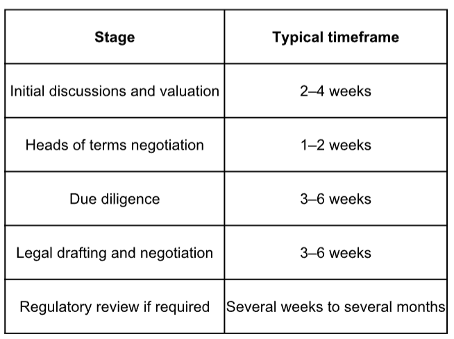 Straightforward transactions may complete within eight to twelve weeks. Cross-border or regulated deals often take longer.